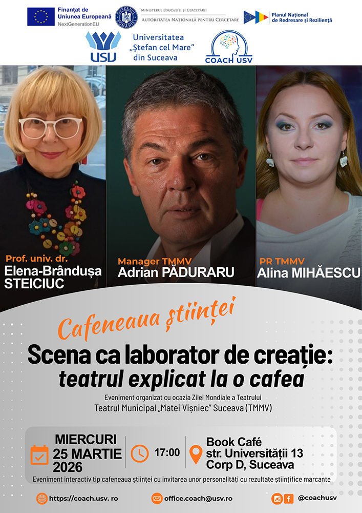 Miercuri, 25 Martie 2026, începând cu ora 17:00, la Universitatea Ștefan cel Mare Suceava va avea loc evenimentul Cafeneaua științei.