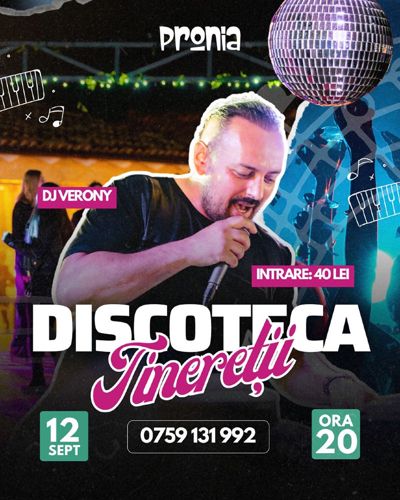 Vineri, 12 Septembrie 2025, începând cu ora 20:00, Pronia din Suceava te invită la Discoteca Tinereții cu Verony.