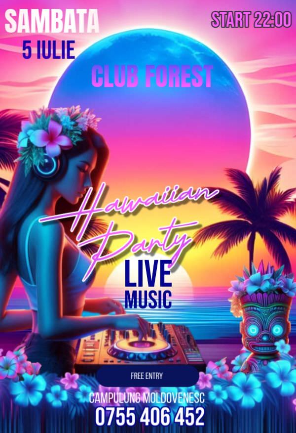 Sâmbătă, 5 Iulie 2025, începând cu ora 22:00, Forest – club & entertainment din Câmpulung Moldovenesc te invită la Hawaiian Party.