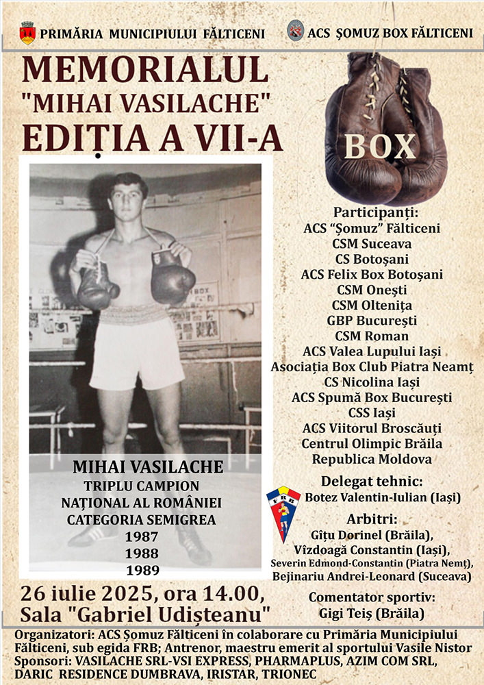 Sâmbătă, 26 Iulie 2025, începând cu ora 14:00, la Sala Gabriel Udișteanu din Fălticeni va avea loc Memorialul Mihai Vasilache, ediția a VII-a.