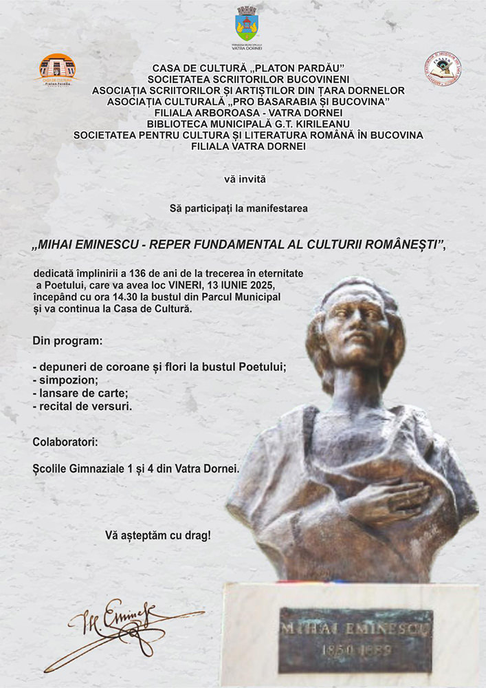 Vineri, 13 Iunie 2025, începând cu ora 14:30, la Vatra Dornei va avea loc evenimentul Mihai Eminescu – reper fundamental al culturii românești.