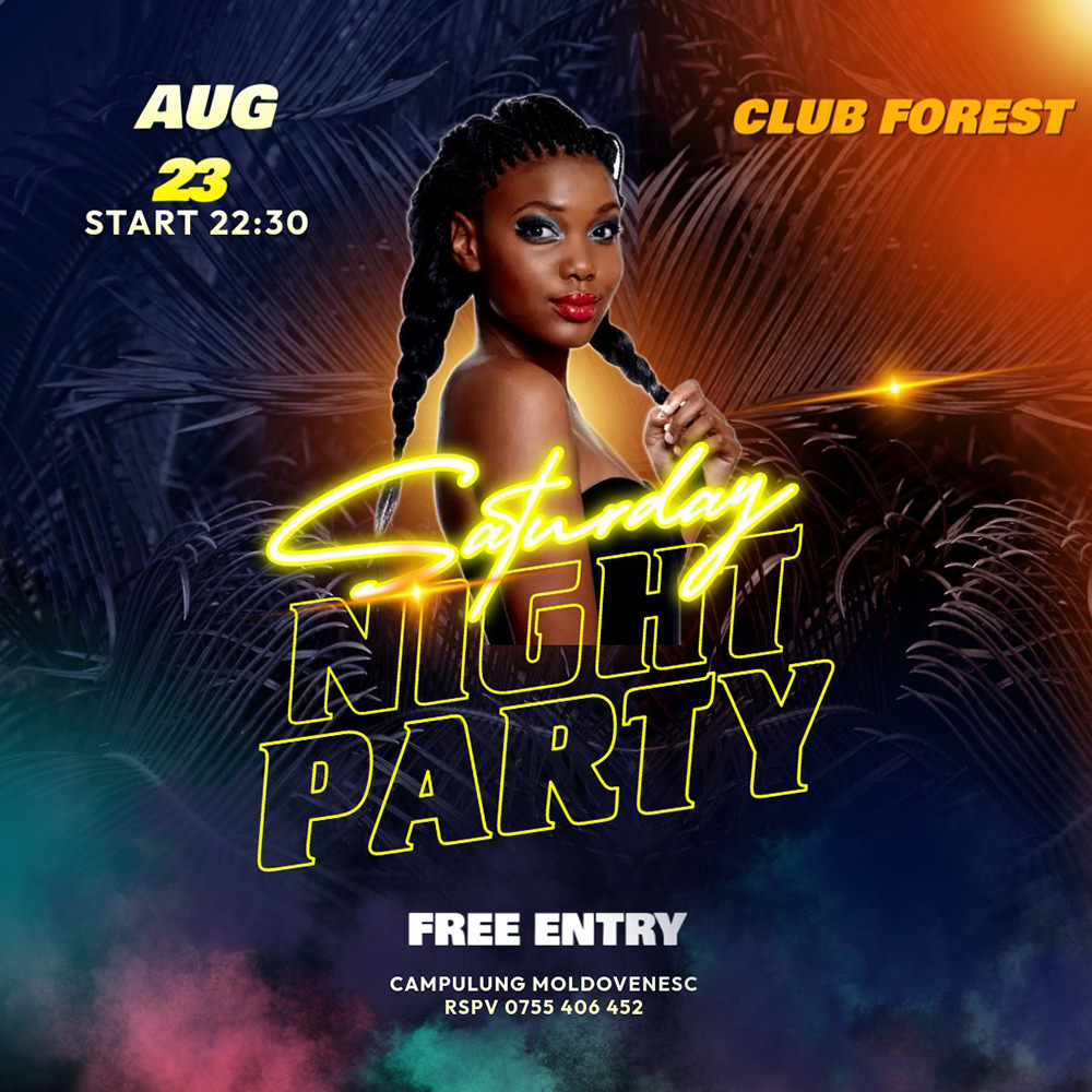 Sâmbătă, 23 August 2025, începând cu ora 22:30, Forest – club & entertainment din Câmpulung Moldovenesc te invită la Saturday Night Party.