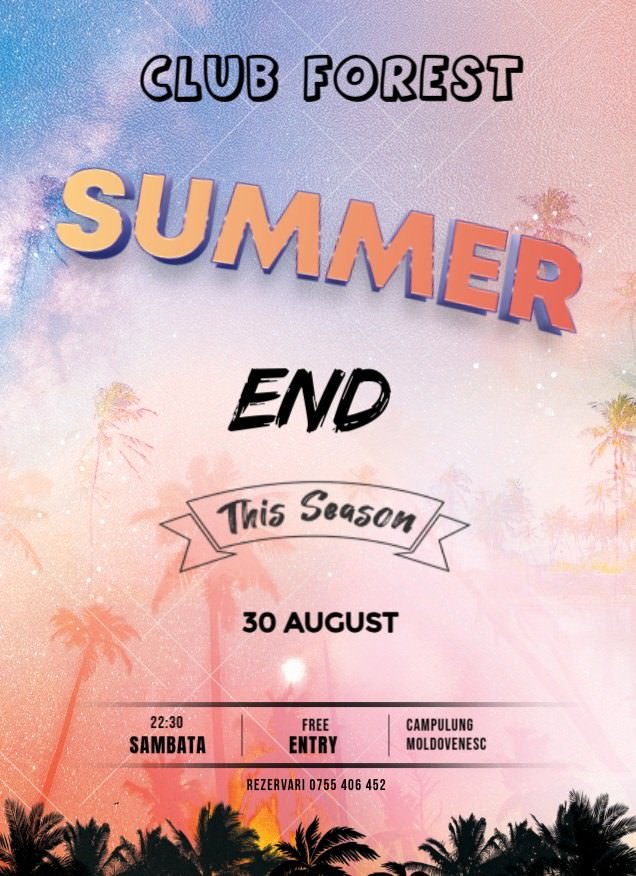 Sâmbătă, 2 August 2025, începând cu ora 22:30, Forest – club & entertainment din Câmpulung Moldovenesc te invită la Summer End The Season.
